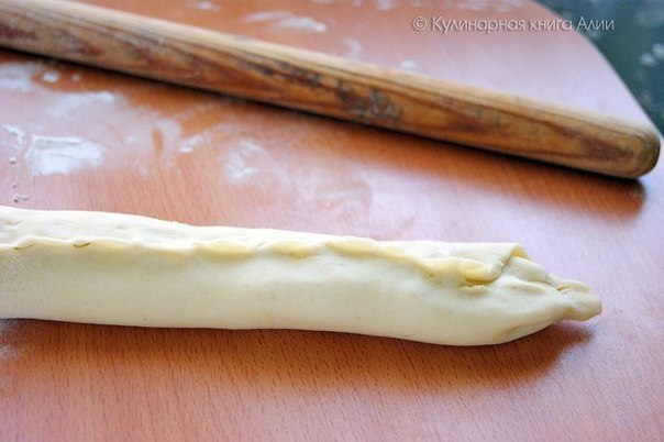 Руку припыливаем мукой и ребром ладони делаем распиливающие движения впереди назад. При этом колбаска наша начинает кататься по столу и приобретать талию…